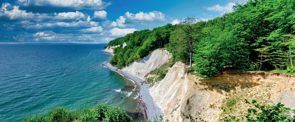 Die berühmten Kreidefelsen erstrecken sich entlang der Küste des Jasmund-Nationalparks im Nordosten der Insel und bieten einen atemberaubende An- und Ausblicke. Sie bestehen aus feinster weißer Kreide, die vor rund 70 Millionen Jahren im Zuge der Kreidezeit entstanden ist. Die Felsen sind ständig in Bewegung, da die Naturgewalten wie Wind und Wellen sie stetig neu formen. Es entstehen immer wieder neue bizarre Formationen, die Fotografen und Naturfreunde gleichermaßen begeistern. Der bekannteste Kreidefelsvorsprung ist der Königsstuhl, der mit einer Höhe von 118 Metern das Wahrzeichen Rügens darstellt.
