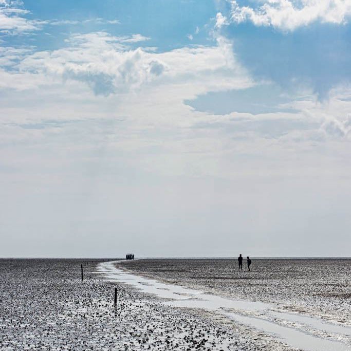 Die Rundstrecke zur Hallig Südfall beträgt über 14 Kilometer und dauert ca. 6 Stunden, inklusive einer 1-stündigen Pause für ein leckeres Essen bei Wirtin Hallig. Das Watt auf dieser Tour besteht größtenteils aus hartem Sandwatt. Die 8 Kilometer lange Wanderung nach Nordtrandischmoor ist eine anspruchsvollere Route, da sie durch das Watt führt. Schlammwandern erfordert Konzentration und Gleichgewichtssinn. Mit ein wenig Übung findet jeder seine eigene Technik. Die Dauer der Tour beträgt ca. 4,5 bis 5 Stunden, einschließlich eines Halts und einer Pause in Halligkrog. Grundsätzlich sollten Sie das Watt nicht unterschätzen. Vermeiden Sie es, außerhalb des sicheren Ufers alleine zu wandern. Tragen Sie im Sommer unbedingt einen Sonnenschutz auf dem Kopf und Sonnencreme auf der Haut. Für den Fall plötzlicher Wetterumschwünge ist Wechselkleidung nützlich. Wattsocken sind praktisch, wenn Sie über ein Muschelbett wandern.